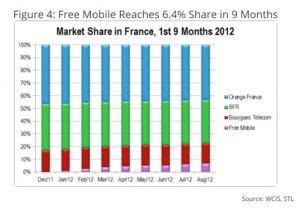 The crucial element in Free’s success was the roaming contract with Orange (one of the major networks in France), which let Free to use Orange’s network when its customers were outside its coverage areas.  The roaming deal, which was imposed by the France’s regulator, allowed Free to overcome the fact that its network only had 25% coverage to start with.