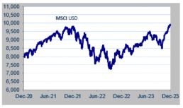 In the United States, the Federal Reserve has indicated that it thinks rates have peaked. At its last meeting of the year, the FOMC held the Federal Funds target unchanged at a range of 5.25-5.5%.