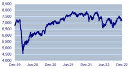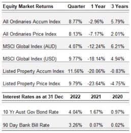 In Australia, the Reserve Bank (RBA) continued to raise rates over the quarter and at year end the cash rate was 3.10%. The Board noted that it expects to increase rates further over the period ahead but subject to incoming data and the assessment of the outlook for inflation and the labour market. It is interesting that the RBA has been less aggressive with its rate rises than other central banks, which suggests that it will tread very carefully in 2023 to avoid a recession in Australia.