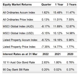 The Reserve Bank of Australia (RBA) maintained the cash rate at 10 basis points at its April meeting but in its commentary dropped the word ‘patient’ so that we now expect a minimum 15bp rate increase by the June meeting. Significant further rate rises are expected over FY23 as inflation takes hold in Australia. Over the quarter, market rates moved higher with 90 day bank bills moving from 0.07% to 0.23%, 3 year Government Bonds 0.88% to 2.33% and 10 year Government Bonds 1.61% to 2.83%. These rates are also expected to rise over the next financial year.