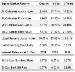Cash rates remained unchanged in most developed countries, and those that raised them did so by trivial amounts. Focus however is now on when major central banks will commence raising rates (and cease massive bond buying) particularly in the context of the emergence of inflation, which ended the year at levels not seen since the 1980s. In the US the latest inflation figure was 6.8% and in the Euro area 4.9%. Significantly, bond yields have not reacted having risen barely 0.5% to 0.7%, leaving them well below the headline inflation level. The Australian 10 year bond yield rose 0.7% to 1.6% against our inflation rate of 3.0%.